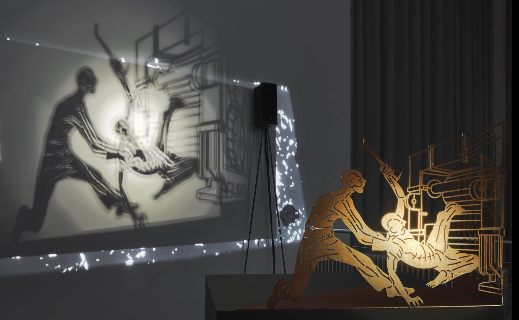 The installation, assembled from cut steel plates, is anchored on a scaffolding structure resembling a factory. The individual figurative scenes depict the struggle between luddites and machines in a visual style inspired by historical workplace accident prevention posters, early labor movement agitation flyers, and the visual language of Otto Neurath and Gerd Arntz. Some of the figurative scenes are animated using a wind turbine at the top of the structure and mechanical transmissions, similar to an animatronic puppet theater. The machines, powered by renewable energy, wear out through friction, and their endless movement ironically leads to their own destruction.