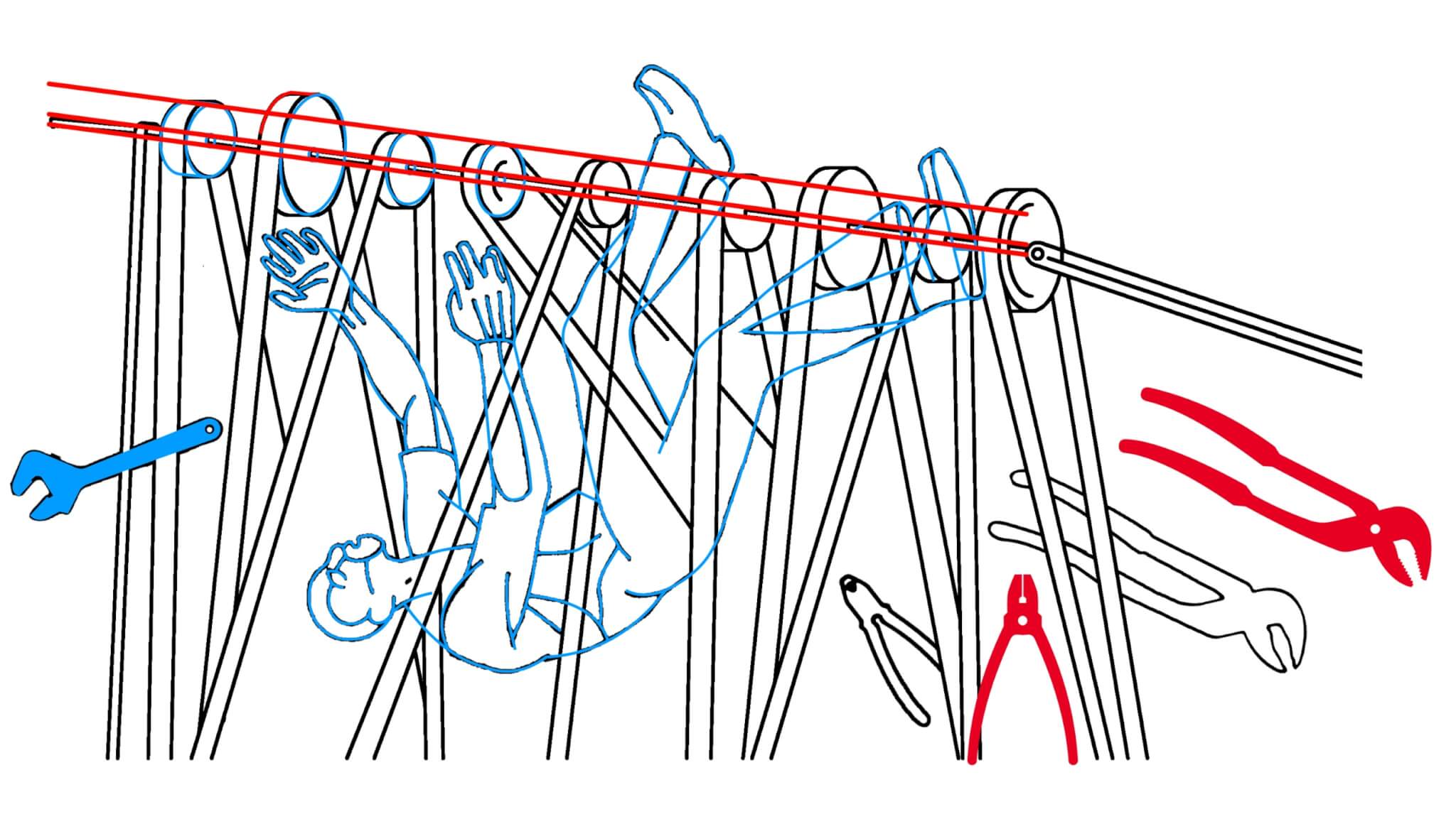 Randomroutines, the Budapest-based artistic duo of Tamás Kaszás and Krisztián Kristóf, have been active on the art scene since 2003. Their collaborative work, diverse in both media and themes, is united by material experiments, a punk ethic, and an interest in humanity and human labor. Although they have developed a recognizable style in the form of spatial drawings made from welded rebar rods, they continue to seek other, programmatically random means. As artists from post-Soviet Central Europe, they are exposed to the re-evaluation of the history of building socialism and the ongoing transformation. Their specific experience built on the ruins of communism allows them to work with the aesthetics of socialist realism as a comic strip, retelling or even completing the history of the labor movement. The bright future is over, replaced by apocalypse, entropy, and a return to the fist axe.