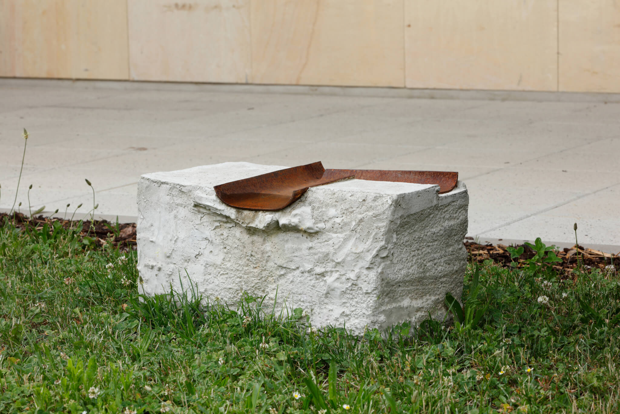 Autor má však ve svém repertoáru také kusy, které nás s vlastní dočasností mají smiřovat. Nechává je zapomenuté v trávě, opršené, reznoucí. Betonové kostky nebo zemní odlitky protínají dřevěné špalíčky, které tu nebudou věčně. Stejně tak rezavé železné prvky dávají čas vodě pracovat na pozvolné destrukci materiálu. Tak se v oltářících naší krátké současnosti protíná koncept zániku a věčnosti.